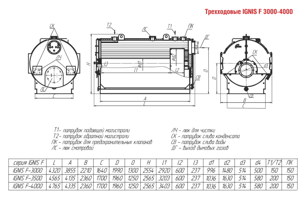Технические характеристики водогрейного трёхходового котла ARCUS IGNIS F-3000