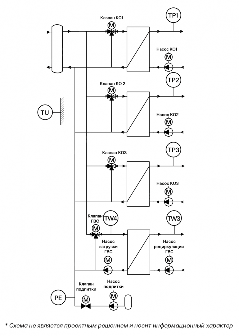 В контроллер установлено прикладное программное обеспечение (ПО) ООО «ЭНТРОРОС», выполняющее сбор и обработку данных, заведённых в ПЛК; по этим данным формируются алгоритмы управления контурами отопления (КО).